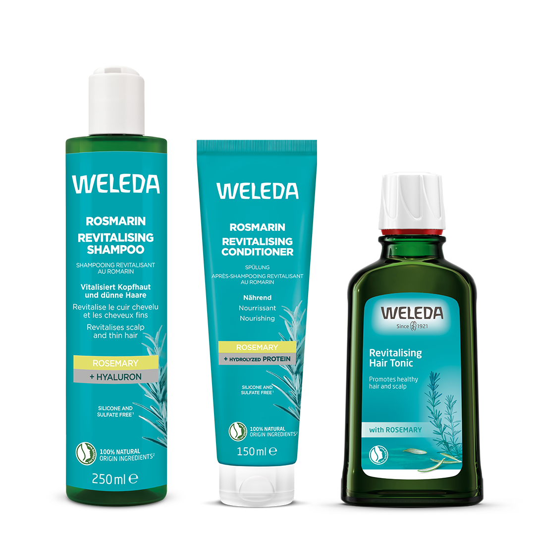 Rosmariini elustav juuksetoonik: Tugevdab juukseid, toniseerib peanahka ja aitab hõrenevate juuste korral. 100ml
